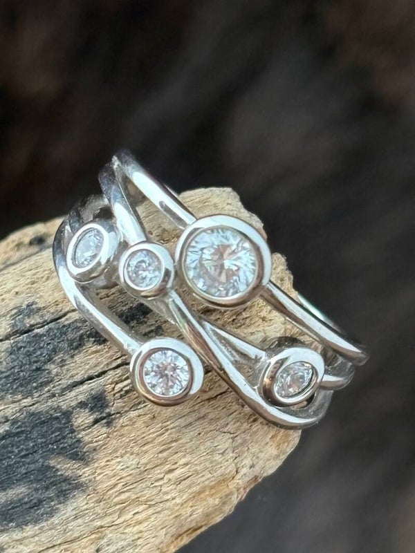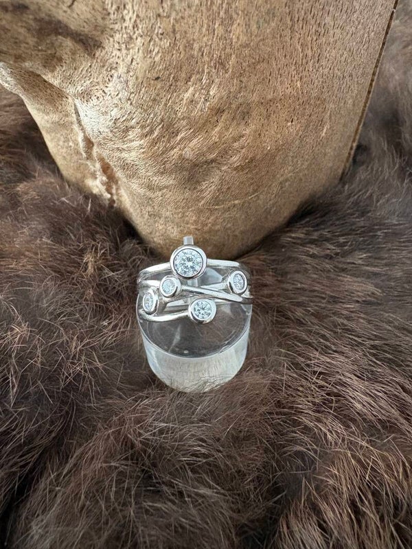 Zilver gerhodineerde ring met 5 zirkonia's 13,5 mm breedt en in maat 19 1/4 eventueel in een andere maat te bestellen in dien mogelijk of of maat te maken