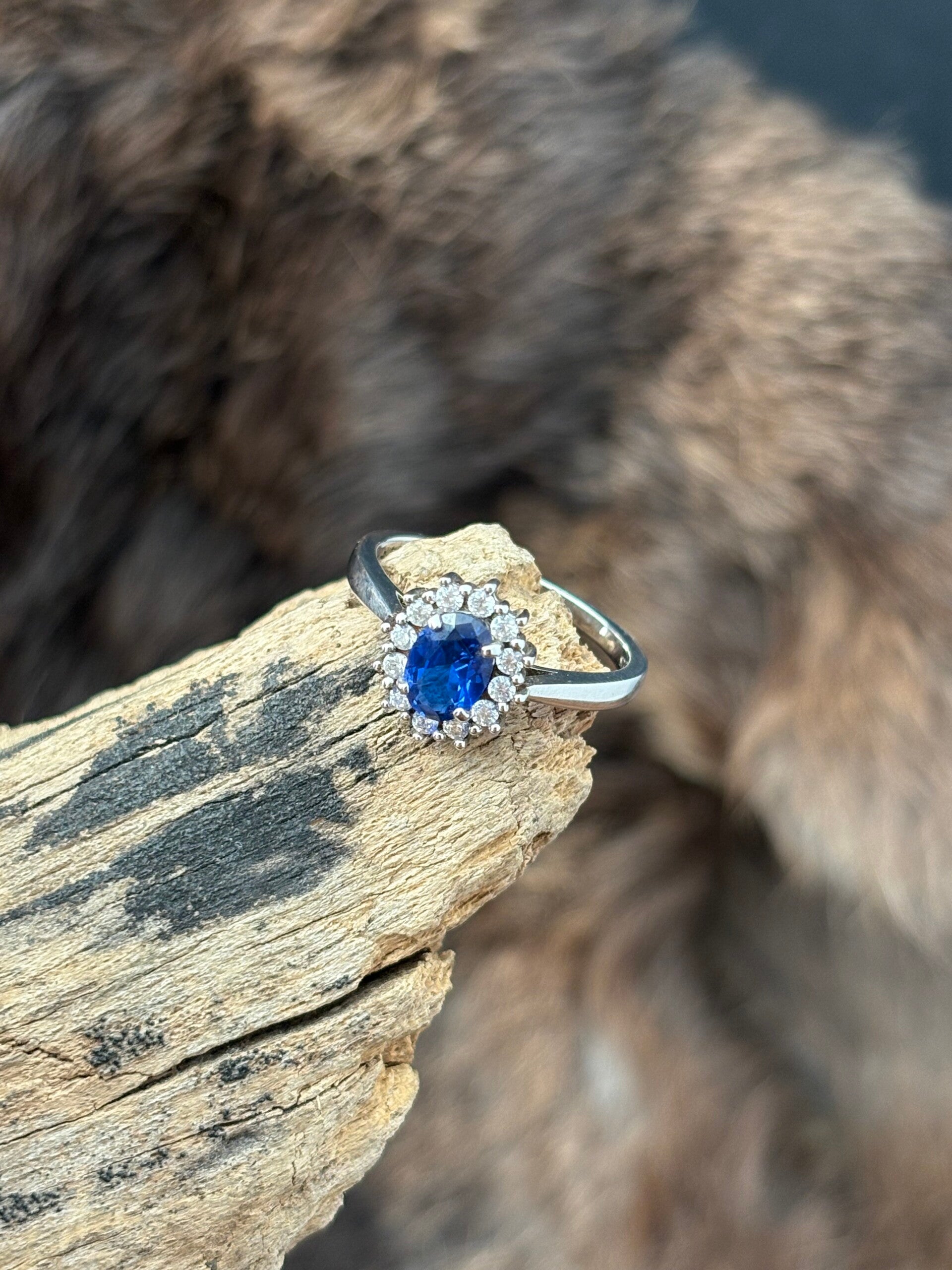 zilveren gerhodineerde Ron met zirkonia en synthetisch saffier maat17 1/4 andere maten in overleg