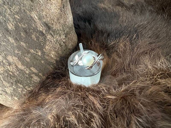 zilver gerhodineerde ring met bloemmotief en zoetwater parel 6,8 mm maat 18 1/2 voor andere maat stuur een. Whatsapp voor de mogelijkheden